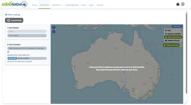 - Enter your address and postcode to locate the farm on the Map, OR upload your paddocks if you currently have a digital farm boundary map, file formats accepted include; KML or Geojson(JSON) files.