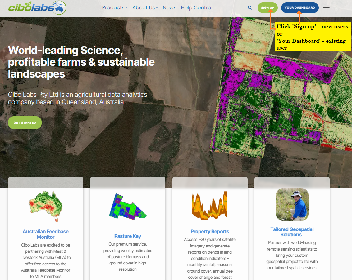 The Cibo Labs dashboard can be accessed directly by producers by heading over to our Cibo Labs Website and login (with a myMLA user account) or Sign Up following these steps (using your email address):